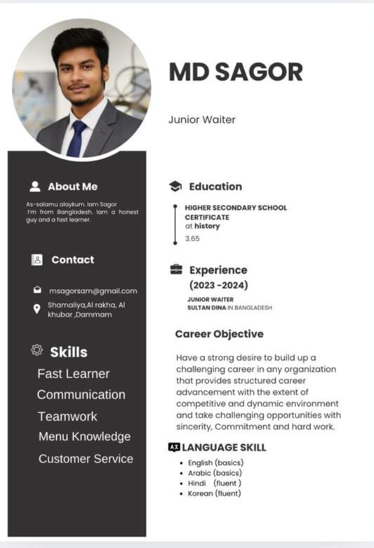 Assalamualaiqum. I am Sagar. I am from Bangladesh. I can work as a Waiter or food runner. I have 4 years experience as a waiter at Bangladesh. If there is any other scope for me I can do thar also