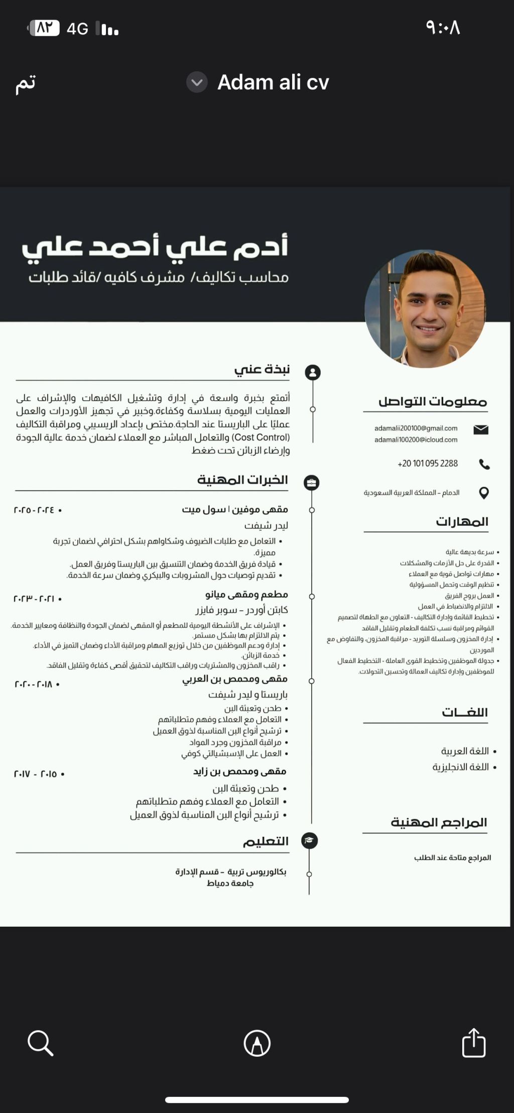 نبذة عني أتمتع بخبرة واسعة في إدارة وتشغيل الكافيهات والاشراف على العمليات اليومية بسلاسة وكفاءة. وخبير في تجهيز الأوردرات والعمل عمليا على الباريستا عند الحاجة. مختص باعداد الريسيبي ومراقبة التكاليف (Cost Control) والتعامل المباشر مع العملاء لضمان خدمة عالية الجودة وارضاء الزبائن تحت ضغط