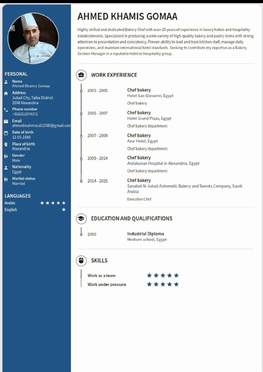 شيف ماهر في مجال البيكري (معجنات وكرأسون) متواجد في الجبيل البلد