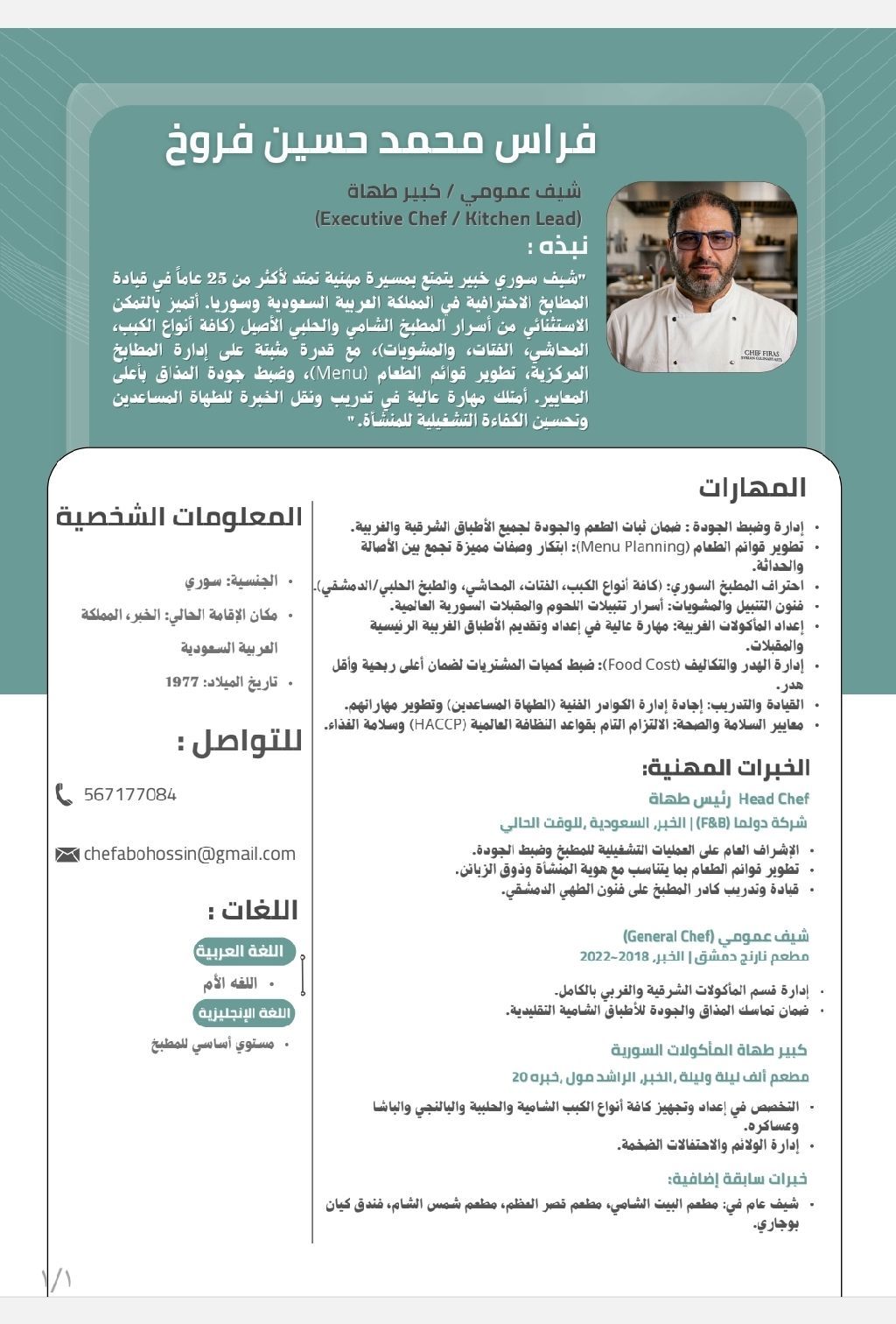 شيف خبرة بالأكل الشرقي والغربي وجميع أنواع الكبة حفلات كاترينج بوفيهات فطورات سورية عملت شيف عام مطعم ألف ليلة وليلة 20 سنة عملت شيف عام مطاعم نارنج دمشق وقصر العظم والبيت الشامي 4 سنين ونصف افتتحت مطعم الشيف الحلبي ومطعم شمس الشام متاح نقل كفالة