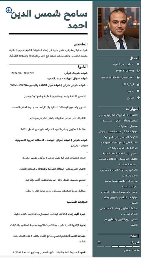 Operations Manager with over 20 years of experience in the confectionery, restaurant, and café industry in Egypt and Saudi Arabia. A graduate of the Faculty of Tourism and Hotels, Cairo University, currently residing in Al - Baha, Saudi Arabia. Valid residency permit, driver's license, and unified health certificate. Ready for sponsorship transfer with a suitable job opportunity. area or operation