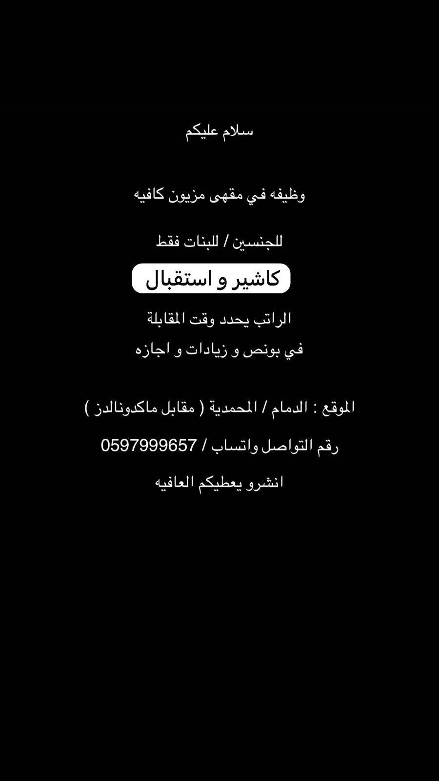 وظيفة في مقهى الدمام المحمديه (كاشير / استقبال) فقط بنات
