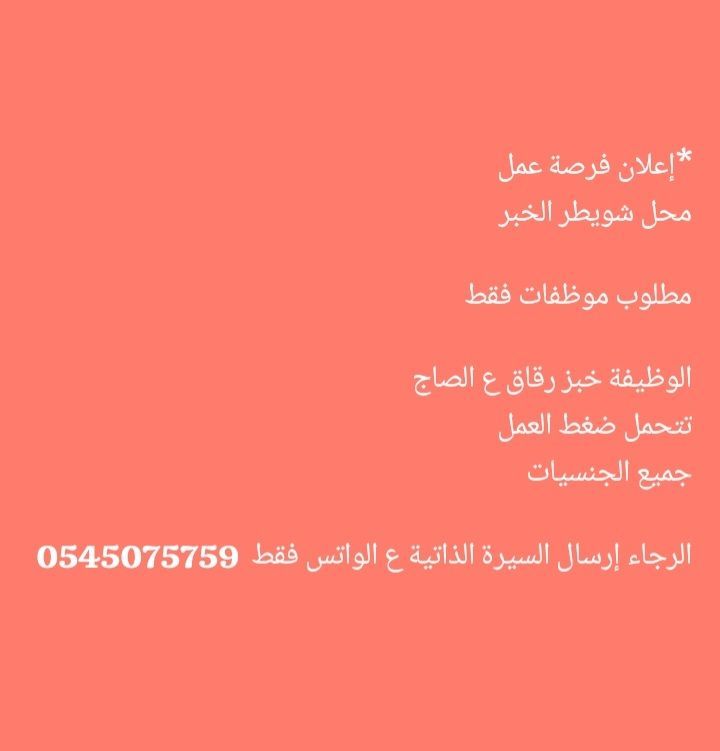 اعلان فرصة عمل محل شويطر في الخبر مطلوب موظفات فقط لمحل شوكلت بالخبر الوظيفة خبز رقاق على الصاج تتحمل ضغط العمل جميع الجنسيات الرجاء إرسال السيرة الذاتية