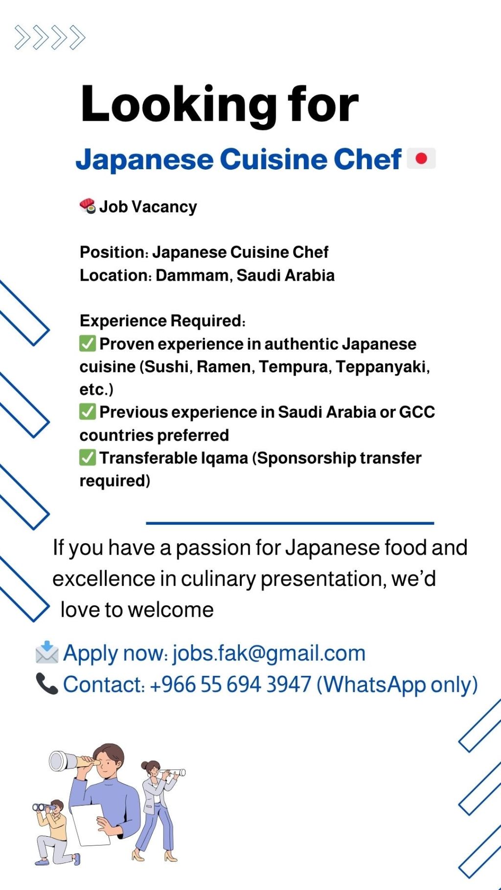 Job Vacancy - Japanese Cuisine Chef Location Dammam, Saudi Arabia We’ re hiring a Japanese Cuisine Chef with proven experience in Sushi, Ramen, Tempura, and Teppanyaki. GCC experience preferred. Transferable Iqama required. WhatsApp only)