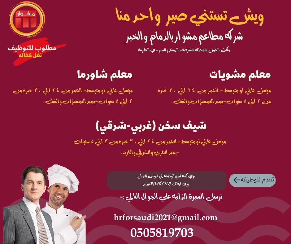 شركة مطاعم مشوار في الدمام والخبر مكان العمل المنطقة الشرقية - الدمام والخبر - حي العقربية معلم مشويات مؤهل عالي أو متوسط - العمر من 24 الى 30 خبرة من 3 الى 5 سنوات - يجيد التجهيزات والشك. معلم شاورما مؤهل عالي أو متوسط - العمر من 24 الى 30 خبرة من 3 الى 5 سنوات - يجيد التجهيزات والشك