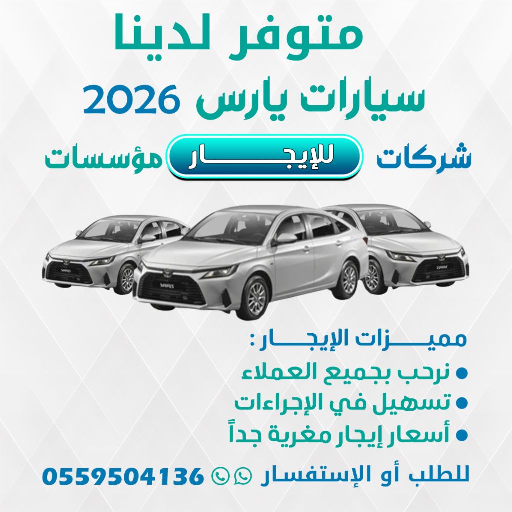 تويوتا ياريس 2026 (ستاندرد) للإيجار للمؤسسات والشركات، جديدة بالكامل (صفر وكالة)، ناقل حركة أوتوماتيكي، بنزين. مؤسسة تور ود توفر لكم سيارات تويوتا ياريس 2026 (ستاندرد) للإيجار - للمؤسسات - للشركات. مميزاتنا: نرحب بجميع العملاء - تسهيل في الإجراءات - أسعار إيجار جذابة جداً. للتواصل أو الاستفسار.