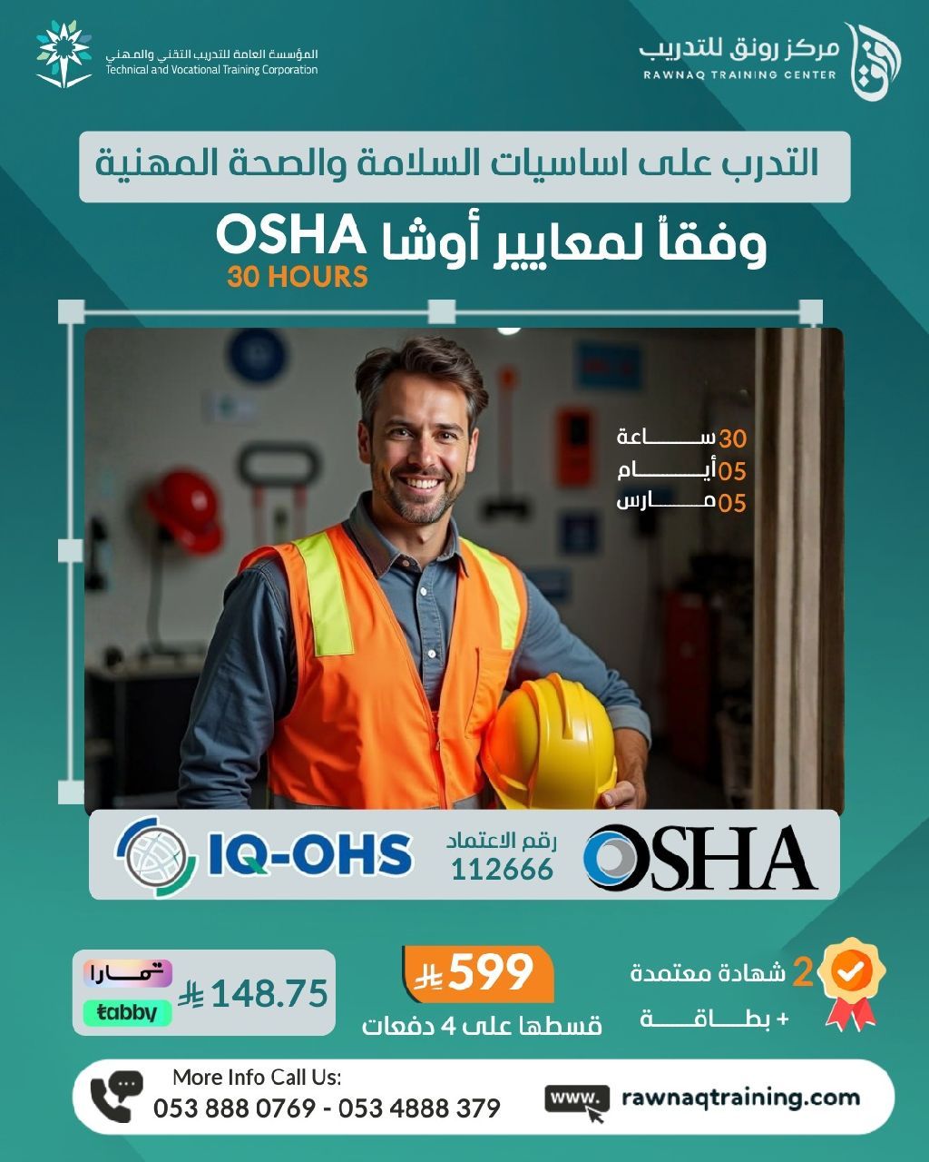 دورة أساسيات السلامة والصحة المهنية وفقا لمعايير OSHA تفاصيل الدورة شهادتين + بطاقة معتمدة لكل متدرب المدة 5 أيام (30 ساعة تدريبية) السعر 599 ر س فقط بدلا من 990 ر س الاعتماد معتمدة من المؤسسة العامة للتدريب التقني والمهني معتمدة من مؤسسة OSHAcademy الأمريكية التدريب باشراف مدربين معتمدين متاحة للرجال والنساء تقسيط متاح عبر تمارا وتابي رسوم رمزي