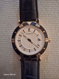 هذه ساعة يد رجالية طراز Versace V Race 23C. العلامة التجارية فيرسا تشي (Versace) الموديل يعرف ضمن مجموعة V Race، المواد مصنوعة من الفولاذ المقاوم للصدأ (All Stainless Steel) ومطلية بالذهب. الميزات زجاج من الياقوت الكريستالي المقاوم للخدش (Sapphire Crystal) صناعة سويسرية (Swiss Made) مقاومة للماء حتى عمق 50 متر (Wate