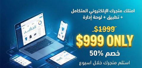 عرض خاص - لفترة محدودة فقط امتلك متجر الكتروني احترافي + تطبيق جوال + لوحة إدارة شاملة بسعر 999 دولار فقط بدلا من 1999 دولار (خصم 50%) نجهز لك متجر الكتروني متكامل يناسب جميع الأنشطة، بتصميم احترافي سريع ومتجاوب، وتطبيق جوال ومتجر وإدارة كاملة وكل هذا خلال أسبوع واحد فقط ماذا ستحصل عليه متجر الكتروني + تطبيق جوال احترافي تصميم وفق الهوية البصرية التي تختارها واجهات سهلة الاستخدام