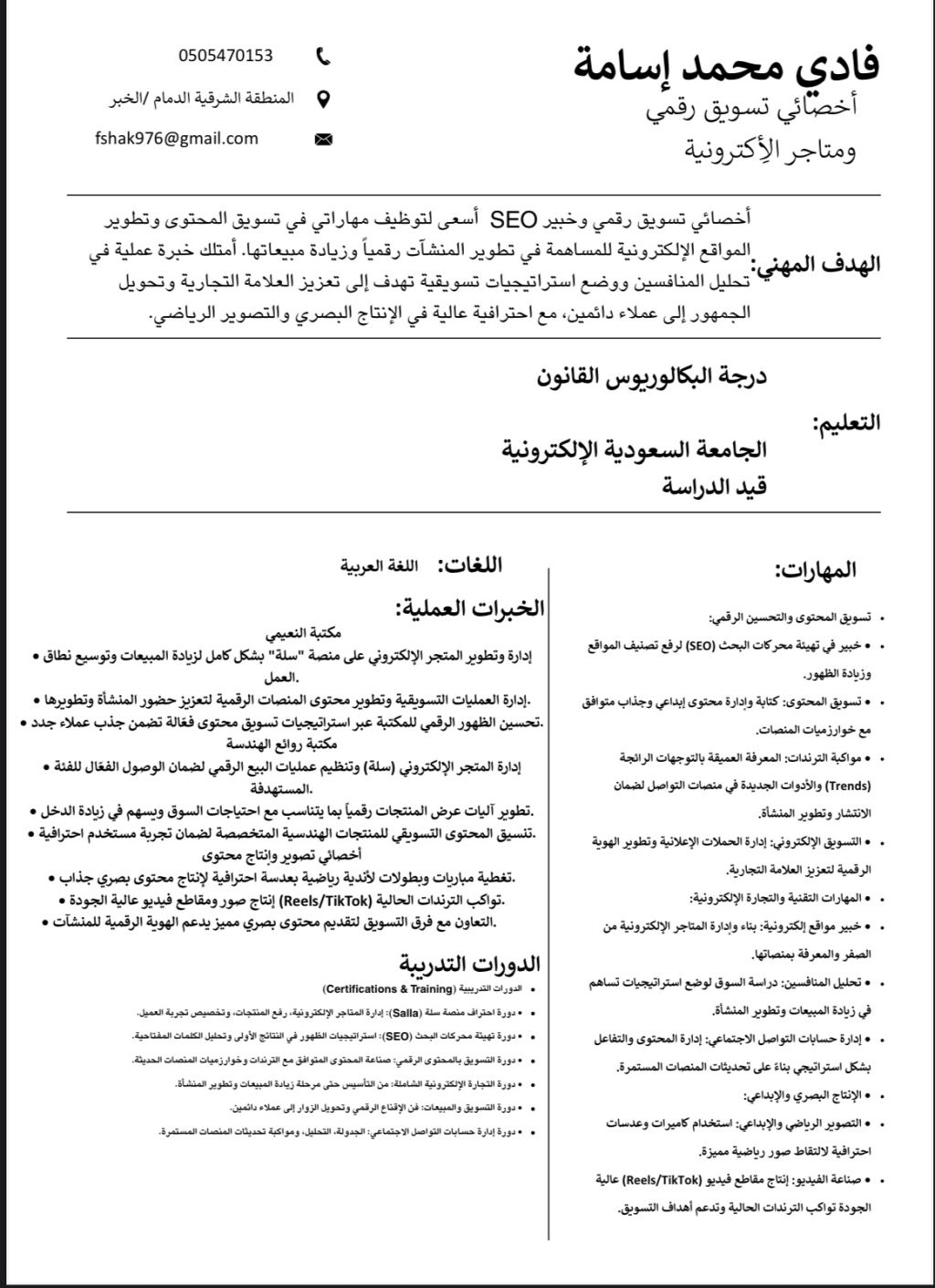 متخصص في المتاجر الالكترونية بخبرة في ادارة حسابات السوشل الميديا ومتابعة أحدث التحديثات والترندات الدائمة وبناء المتاجر الالكترونية والمواقع الالكترونية من الصفر وخصوصا على سلة امتلك خبرة في تحسين محركات البحث Seo واعداد غوغل سيرش كونوسل وغوغل ميرشنت اضافة الى ادارة الطلبات والتنسيق مع شركات الشحن والتواصل مع العملاء أسعى الى تحسين الأداء الرقمي وبناء هوية ممتازة مكان التواجد المنطقة الشرقية