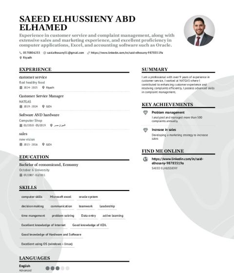خبرة كبيرة في مجال خدمة العملاء والمبيعات واستخدام برامج الحاسب الآلي والأكسيل وبرامج المحاسبة مثل اوركال متواجد حاليا في الدمام وابحث عن وظيفة