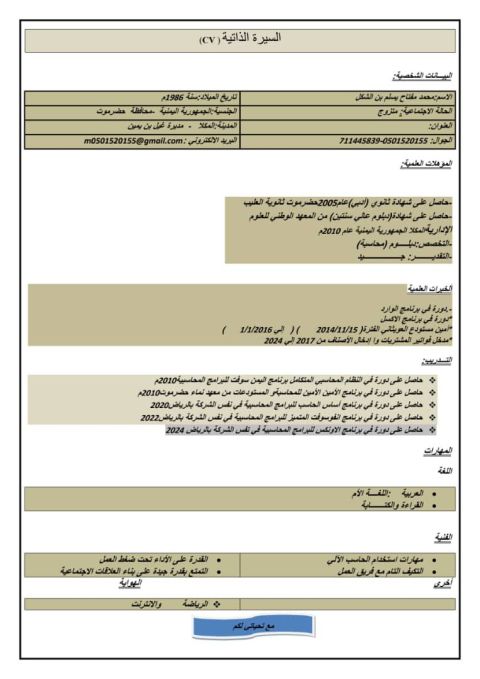 محمد عمر، سوداني الجنسية، من مواليد 2003، مقيم في جدة. حاصل على مؤهل في تقنية المعلومات، أجيد العربية والانجليزية بمستوى ممتاز جدا. لدي خبرة في العمل لدى مؤسسة حلول والحرا زي للخدمات العامة. امتلك مهارات الحاسب الآلي (وورد واكسل) والجدية في العمل، والقدرة على تحمل ضغوط العمل. أسعى لتطوير قدراتي وخدمة المجتمع بروح مسؤولية عالية