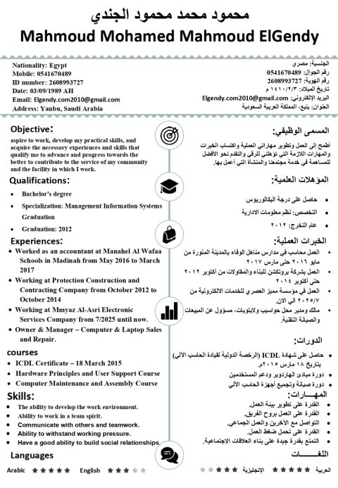 أنا محمود محمد، ابحث عن فرصة عمل لدي الخبرة في ادخال البيانات ولدي مهارات عالية في الدقة، وتحمل ضغط العمل، والالتزام بالمواعيد. اقامتي سارية المفعول مجدده لسنة، وأنا جاهز للعمل فورا في أي مدينة داخل المملكة. ابحث عن جهة جادة ترغب في موظف ملتزم وذو خبرة، أجيد (صيانة الالكترونيات والشاشات وصيانة الكمبيوتر واللابتوب) خبرة من مجال المكتبات والخدمات الالكترونية للتواصل