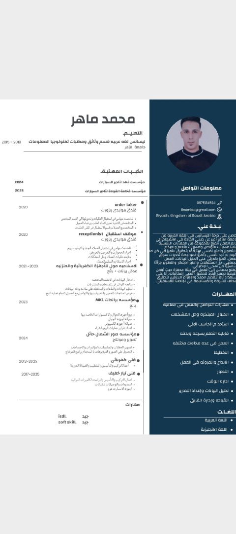 باحث عن عمل - مدخل بيانات / دعم فني لدي خبرة في استخدام الحاسوب، ادخال البيانات بدقة وسرعة، والدعم الفني وحل مشاكل اجهزة الكمبيوتر والبرامج والطابعات والشبكات الأساسية. أجيد العمل على Microsoft Office، وأتميز بالجدية، سرعة التعلم، والالتزام بالعمل. للتواصل
