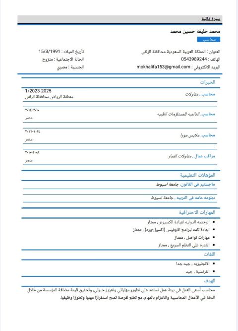 محاسب مصري خبرة أربع سنوات متواجد في جدة للتواصل