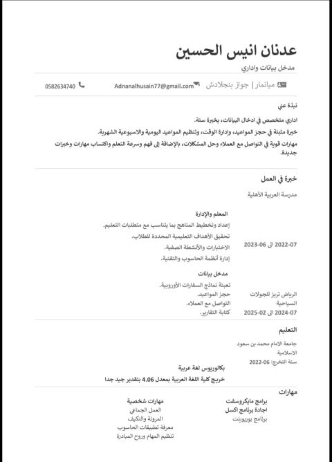 باحث عن عمل اداري متخصص في قسم السياحة والتأشيرات ومعلم لغة عربية اطمح لاكتساب وتطوير مهارات وخبرات جديدة وتوظيف مهاراتي المكتسبة مع فريق العمل للوصول الى النجاح