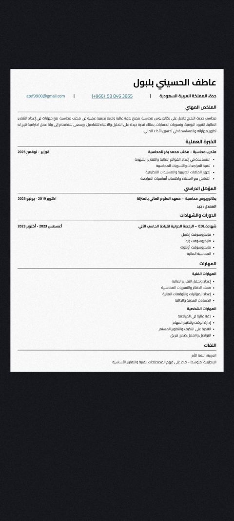 محاسب حديث التخرج، سوداني الجنسية، حاصل على درجة البكالوريوس في المحاسبة، ابحث عن فرصة عمل لاكتساب الخبرة العملية وتطوير مهاراتي في المجال المحاسبي. أجيد أساسيات المحاسبة، التعامل مع البرامج المحاسبية، واستخدام برنامج Excel، ولدي رغبة جادة في التعلم والالتزام والعمل ضمن فريق