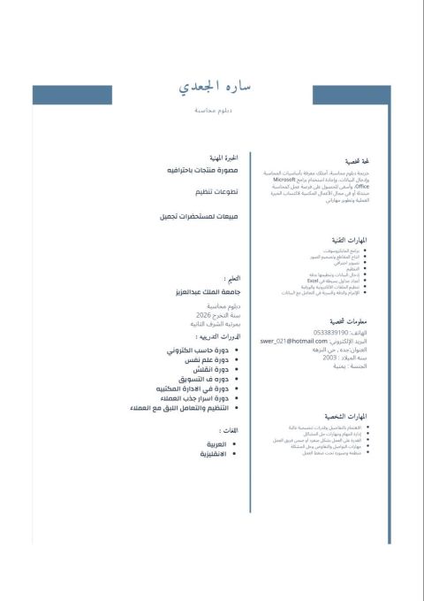 ساره الجعدي عمري 23 سنة يمنية مواليد السعودية بإقامة سارية المفعول ابحث عن وظيفة مكتبية سكرتيرة مدخلة بيانات كاشير كول سنتر استقبال مساعدة ادارية ولدي خبرات مكتسبه اطمح في تطويرها درست وتخرجت في جامعة الملك عبدالعزيز في جدة في تخصص المحاسبة