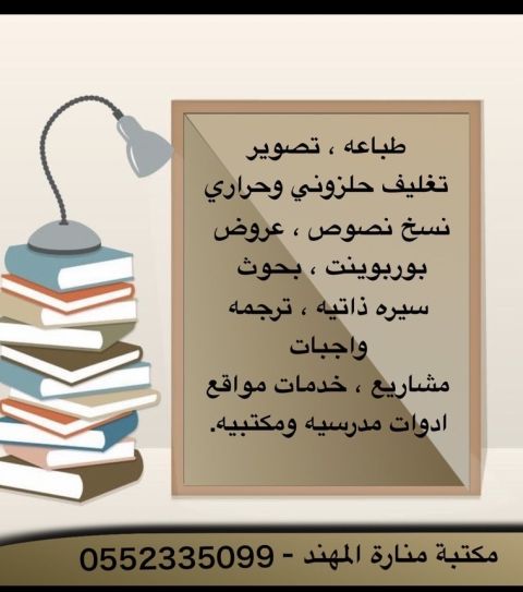 ابحث عن شخص للعمل في خدمات طلابيه يكون ملم في أعمال الأبحاث والتغليف والكتابة والتصوير لتفاهم التواصل ع الرقم الموقع الباحة المخواه الشارع العام