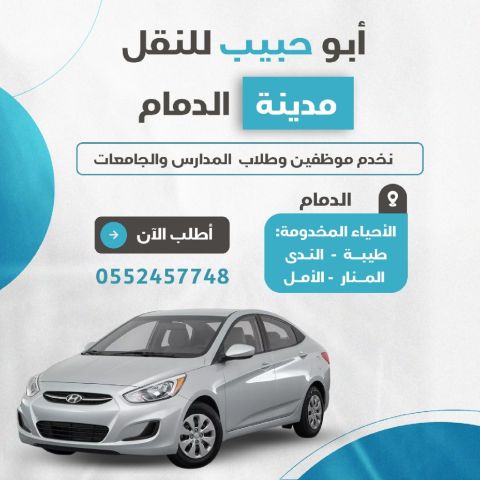 سيارة مكيفة ومجهزة التزام بالمواعيد سائق بخبرة وأمانة نخدم جميع الأحياء الدمام الشرقية. المنار الفيصلية الندى وما حولها. احجز مكانك الآن قبل الزحمة للتواصل أبو حبيب للنقل - راحتك تبدأ معنا