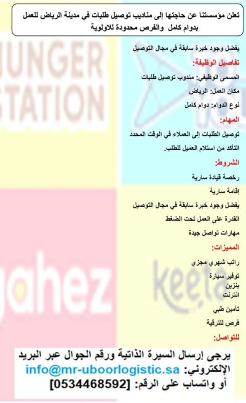 مطلوب بشكل عاجل مناديب توصيل للمطاعم مع سيارات الشركة. مقر الشركة منطقة القدس. نقل كفالة فوري. يشترط وجود رخصة قيادة سارية وإقامة سارية. الراتب الأساسي 1800، مع تحقيق الهدف 450 شهريا، والطلبات الاضافية بمبلغ 7 ريال لكل طلب. توفر الشركة السيارة، الوقود، السكن، التأمين، وشريحة انترنت. لا توجد أي خصومات من الراتب الأساسي اذا لم يتم تحقيق الهدف. هناك مكافأة للأداء الجيد، وفرص للترقية وزيادة الراتب