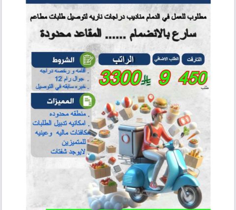 ورحمة الله وبركاته مطلوب مناديب توصيل طلبات تطبيق منطقة العمل حاليا الدمام وجاري فتح منطقة الرياض وجدة جميع الجنسيات متاحة شرط وجود رخصة دراجة نارية أو رخصة نقل خفيف وإقامة سارية 3 شهور واذا الإقامة منتهية يتم التجديد للإقامة مع تحمل الموظف مدة الانتهاء وتتحمل الشركة مبلغ 2000 ريال نقل كفالة للتواصل