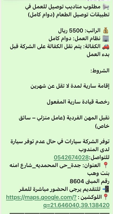 مطلوب مناديب توصيل للعمل براتب 5500 مع امكانية نقل الكفالة قبل بدء العمل شرط هوية سارية ورخصة قيادة مع توفر سيارات في حال عدم وجود سيارة العمل فوري جدة حي المحمدية