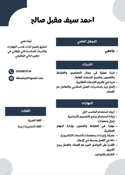 خبرة عملية في مجال التصاميم والطباعة والتصوير، وتقديم الخدمات العامة. خبرة في تقديم الخدمات الطلابية المام جيد بأساسيات العمل المكتبي والتعامل مع العملاء. ايجاد استخدام الحاسب الالى. اجادة استخدام برامج التصميم الأساسية) Canva مث مهارة في الطباعة والتصوير وإدارة المهام المكتبية. معرفة باجراءات ومعاملات الخدمات الالكترونية. دقة في العمل وسرعة في الانجاز. القدرة على التواصل الجيد مع العملاء