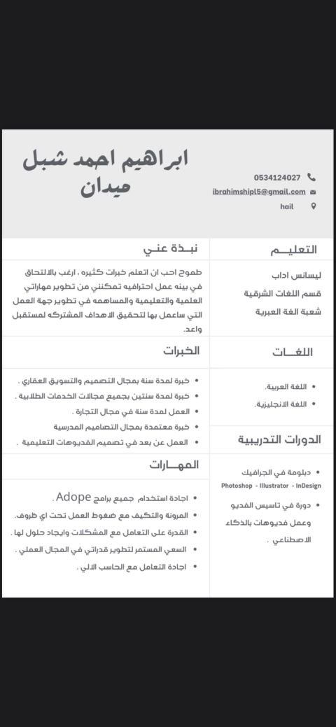 ابحث عن أي عمل في حائل لدي خبرة متوسطة في مجال التصميم الجرافيك ولدي خبرة في مجال الخدمات الطلابيه ولدي خبرة متوسطة في مجال العقارات وشبكة إيجار