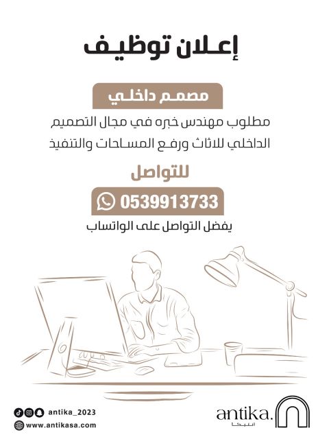 مطلوب مصمم ديزاين داخلي (انتيريال ديزاين) للعمل في معرض متخصص بالأثاث المنزلي والديكورات والتصاميم موقع المعرض شمال الرياض حي الصحافة
