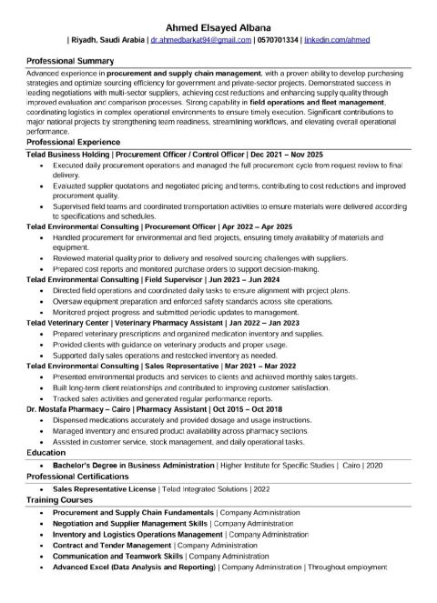 أنا مندوب مشتريات، ولدي خبرة 4 سنوات في مجال التوريد والمشتريات وتنسيق الموردين في مختلف القطاعات. أتمتع بمهارات قوية في التعامل مع طلبات الشراء، وتقييم الموردين، والتفاوض على الأسعار، وضمان تسليم المواد في الوقت المحدد، ابحث حاليا عن فرصة عمل جديدة كمندوب مشتريات، حيث أساهم بخبرتي وأطور مهاراتي وأضيف قيمة للمؤسسة