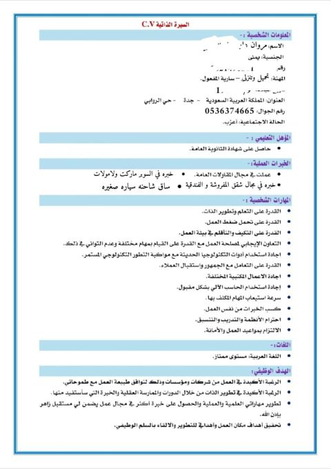 أخوكم زكريا جاي جديد من اليمن إقامة سارية ابحث عن عمل أي فرصة عمل أنا مستعد أواجه ضغوط العمل بمهارة عالية نشيط مظهر لائق التزام تام بالدوام للتواصل