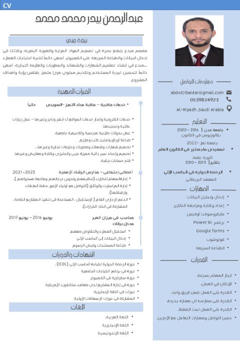 ابحث عن عمل مكتبي في مجال خبرتي وهي سكرتارية، مدخل بيانات، كاشير، مصمم محترف، عمل بحوث أكاديمية متميزة، تقديم جميع الخدمات الالكترونية. كابشر، ناجز، قوى، تقديرات، تقديم زيارات وتجديدها، حجوزات) علما بأنه لدي رخصة دولية في قيادة الحاسب الآلي، وحاصل على البكالوريوس وتمهيدي ماجستير في الشريعة والقانون، ولدي خبرة طويلة في استخدام الكمبيوتر وبرامج مايكروسوفت أوفيس