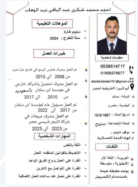أنا اسمي محمد مصري عمري 24 مهنة سائق خاص عنده رخصة سنتين ابحث عن عمل سائق خاص اشتغلت قبل في خدمة العملاء واشتغلت في السيارات الفارهة فاليه عندي مهارة التعلم بسرعة وأستطيع أن اعمل في أي مجال واتمنى أن أجد فرصة عمل مناسبة