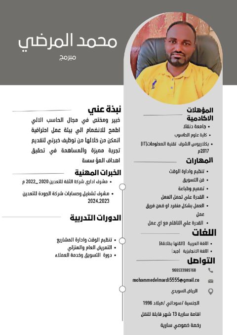 My name is Abu Bakr Mirghani, I am Sudanese. I have a valid heavy vehicle driving license and a valid residency permit. I am looking for work in any field, including transportation, trucks, or as a sales representative. I have over four years of experience in plumbing, having previously worked for a sanitary ware company. Thank you very much