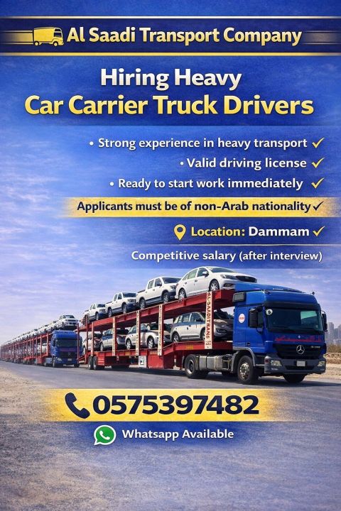 Al Saadi Transport Company Hiring Heavy Car Carrier Truck Drivers Strong experience in heavy transport Valid driving license Ready to start work immediately Applicant must be non - Arab nationality Location Dammam Competitive salary (after interview) Contact WhatsApp Available