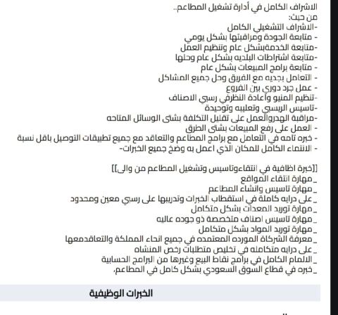 مدير تشغيل مطاعم كبسات وشعبيات راقية خبرة 12 سنة في الاشراف الكامل في تأسيس وتشغيل المطاعم (يمني الجنسية) لدي رسبي وأصناف مميزه ذوجوده عالية على دراية تامة في جميع مدن المملكة ومواقعها المميزه عملت في عدة شركات معروفة على مستوى المملكة بمنصب مدير تشغيل - مدير منطقة - مدير الشؤن الاداريه - مدير تنفيذي جاهزلتواجدفي أي مدينة للتواصل واتساب وإرسال السيرة الذاتية - رخصة - وإقامة - وشهادة - ساريات المفعول