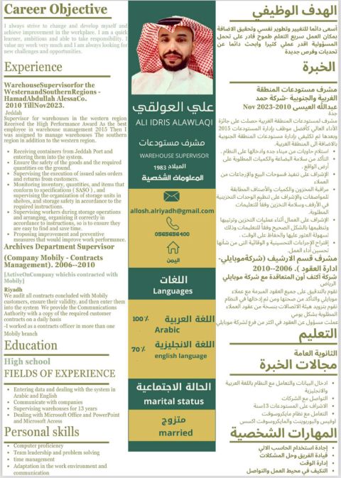 مشرف مستودعات بخبرة تتجاوز 13 سنة في إدارة المخزون وتنظيم العمليات اللوجستية، بالاضافة الى 4 سنوات خبرة في ادخال البيانات على أنظمة ERP باللغة الانجليزية، ضمن عقد تشغيل لصالح شركة موبايلي. أتمتع بمهارات عالية في القيادة، الاشراف على العاملين والسائقين، إدارة الوقت، تنظيم العمل، حل المشكلات بين أفراد الفريق، واعداد التقارير، مع قدرة عالية على تحمل ضغط العمل والعمل الجماعي