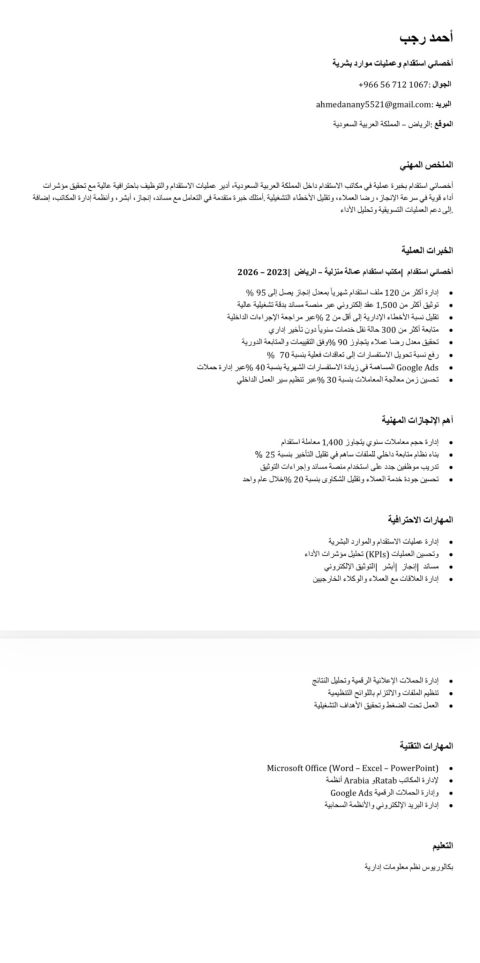أخصائي استقدام وموارد بشرية خبرة عملية في الرياض (2023 - 2026) محترف في إدارة وتشغيل مكاتب الاستقدام والموارد البشرية بخبرة عملية داخل الرياض متخصص في إدارة ملفات العمالة المنزلية، متابعة التأشيرات والتعامل مع الأنظمة الحكومية بكفاءة عالية. إدارة عمليات الاستقدام من التعاقد حتى تسليم العاملة للعميل خبرة عملية في منصة مساند وقوى واجراءات التأشيرات متابعة اجراءات السفارات والتوثيق والعقود تقديم خدمة