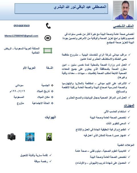 سوداني الجنسية مؤهل جامعي، توجد رخصة وإقامة سارية عملت في مجال مكافحة حشرات أمين مخزن، مشرف محميات طبيعيه للحيوانات، وعملت في كافة مجالات الصحة العامة والسلامة المهنية توجد شهادة النيبوش، اللوشاء، علي دراية بطرق الرياض