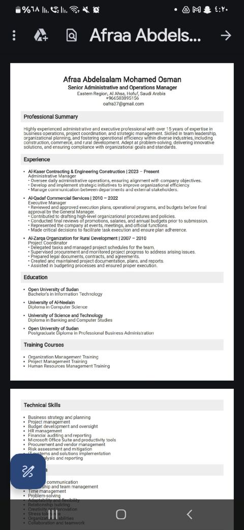 الاسم عمر يوسف حمد سوداني الجنسية، ابحث عن فرصة عمل لدي الخبرة في ادارة حسابات المطاعم وتقفيل الحسابات وخبرة في ادارة الفنادق خبرة 13 عام علي برنامج نزيل وحجوزات البوكنق وخدمة العملاء وضريبة البلدية لدي اقامة ورخصة ساريتين للتواصل الاتصال أو رسالة