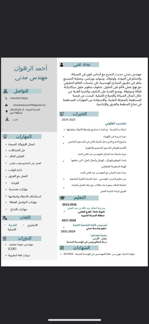 أنا مهندس مدني، ابحث عن عمل في السعودية أنا في المدينة المنورة وابحث عن عمل في أي مكان في السعودية أنا لدي عضوية هيئة المهندسين ولدي رخصة قيادة لدي خبرة سنة وأنا على دراية في البرامج الهندسية مثل برنامج الاوتوكاد والبرما فيرا لدي بعض الدورات وآخرها دوره في كود البناء السعودي ولدي بعض الأعمال من ضمنها مشروع في المسجد النبوي الشريف الجنسية سوري متخرج من جامعة فيلادلفيا في الأردن