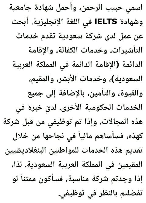 اسمي حبيب الرحمن أحمل شهادة جامعية وشهادة IELTS في اللغة الانجليزية. ابحث عن وظيفة في شركة سعودية تقدم خدمات التأشيرات، وخدمات الكفالة والإقامة الدائمة (الإقامة الدائمة، والإقامة الدائمة، والإقامة الدائمة، والإقامة الدائمة في المملكة العربية السعودية) بالاضافة الى جميع الخدمات الحكومية الأخرى. لدي خبرة في هذه المجالات، لذا اذا حصلت على وظيفة في هذه الشركة، فسأساهم في دعمها ماليا من خلال تقديم