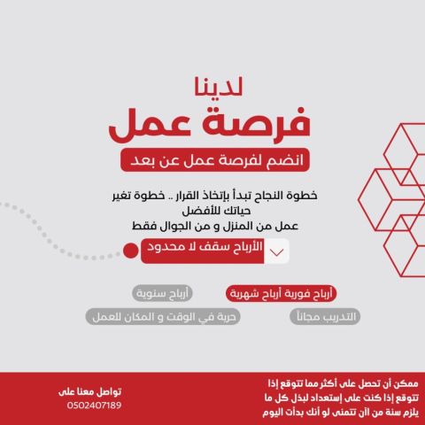 فرصة عمل للنساء داخل المملكة (عن بعد) لكل امرأة تبحث عن دخل اضافي وتغيير جميل في حياتها متاح عمل من المنزل عبر الجوال، تدريب كامل من البداية حتى الانطلاق، ولا يشترط خبرة. الدخل يعتمد على الجدية والطموح، والفرصة مناسبة للي حابة تبدأ بخطوة بسيطة وتوصل لنتائج كبيرة. العمل للسعوديات فقط - الموقع الرياض للتواصل