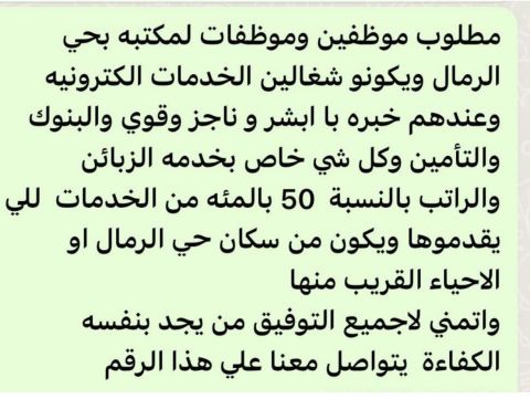 مطلوب موظفين رجال ونساء لمكتبة بحي الرمال سبق لهم العمل في خدمات الكترونية وعندهم خبرة في ابشر وناجز وقوي والبنوك والتأمين وكل شيء خاص بخدمة الزبائن الراتب نسبة 50 من الخدمات التي يقدمها ومن يجد في نفسه الكفاءة ويكون من ساكني الأحياء (الرمال المؤنسية الجنادرية قرطبة القادسية اليرموك) يتواصل عالرقم المرفق