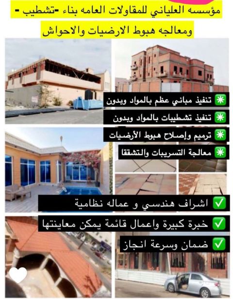 مجال البناء انشاء عظم ترميم تشطيب فلل شقق استراحات شاليهات مجالس هناجر عمارات محطات وقود ملاحق علوية ملاحق أرضيه خزانات مسابح تسوير أراضي ترميم شقق قديمة وجديدة توسعة ارتدادت معالجت هبوط البلاط نعمل بكافة مجالات البناء بوية عزل تكسير ترحيل نعمل تحت اشراف هندسي وبيد عاملة خبيرة بكافة المجالات أسعارنا تناسب الجميع للاتصال ولاستفسار رقم