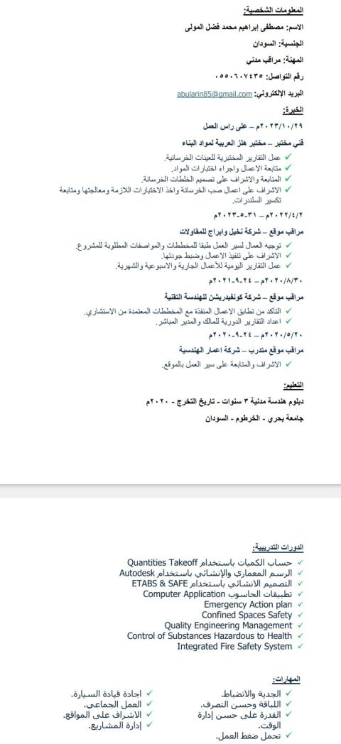 مهندس مدني تقني سوداني مسجل لدي الهيئة السعودية للمهندسين، رخصة قيادة سارية ذو خبرة في الاشراف وإدارة المشاريع الانشائية، خبرة في اختبارات المواد وإدارة المواقع وسأكون اضافة حقيقة للجهة التي اعمل لصالحها، متاح للعمل في جميع أنحاء المملكة