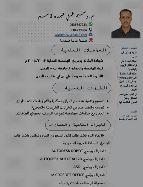 مهندس مدني دفعة 2014، معتمد من شركة المياه الوطنيه مدير مشروع، وأتمتع بخبرة مهنية تمتد الى 11 سنة في مجال التنفيذ وإدارة المشاريع (تشطيبات، خرسانات، بنية تحتية) بالاضافة الى إدارة المواقع. أحمل رخصة قيادة سعودية، كما انني معتمد من هيئة المهندسين السعوديين. لدي خبرة واسعة في جميع أعمال المكتب الفني، وحصر الكميات، وعمل المستخلصات، والتقارير