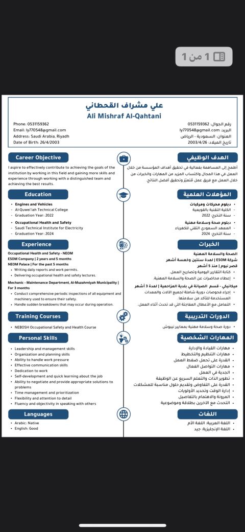 باحث عن فرصة وظيفية ابحث عن فرصة عمل مناسبة في مجال الصحة والسلامة المهنية (HSE) لدي خبرة عملية، والقدرة على الالتزام بتطبيق أنظمة السلامة، اعداد التقارير، متابعة المخاطر، والعمل ضمن فرق متعددة بكفاءة ومسؤولية. مؤهل، جاد في العمل، وقابل للتطوير والتعلم السريع. أفضل بيئة عمل احترافية تقدر الجهد وتتيح فرص نمو حقيقية