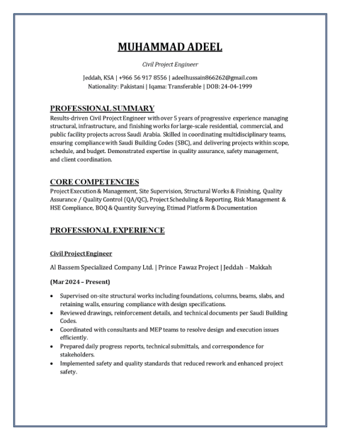 I am Muhammad Adeel, a Civil Project Engineer with 5 + years of experience in execution and supervision of infrastructure, structural, and finishing works for residential, commercial, and public facility projects in Saudi Arabia and Pakistan. Skilled in site management, project execution, QA/ QC, BOQ & quantity take - off, coordination with consultants, project progress reporting, and ensuring compliance